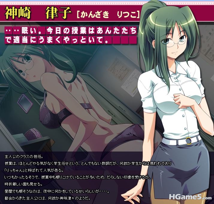 主人公的班主任。 迷糊的班主任 人气很高 爱白天睡大觉 偶尔上课时也会睡 晚上不知道干什么去 对主人公很有兴趣